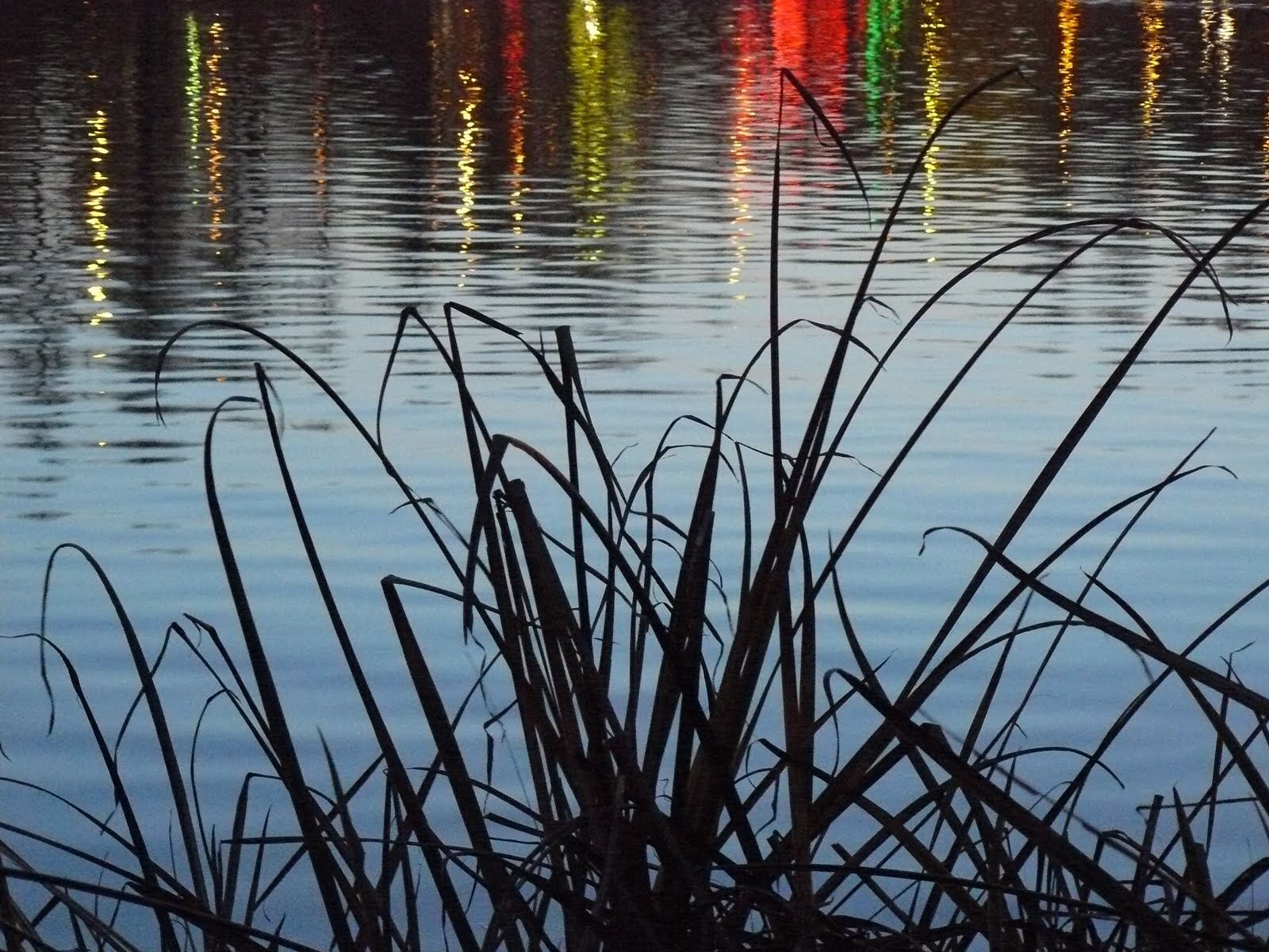 Il y a beaucoup d'activités sur cette rivière. Les reflets de couleurs on dirait des décorations de Noël.